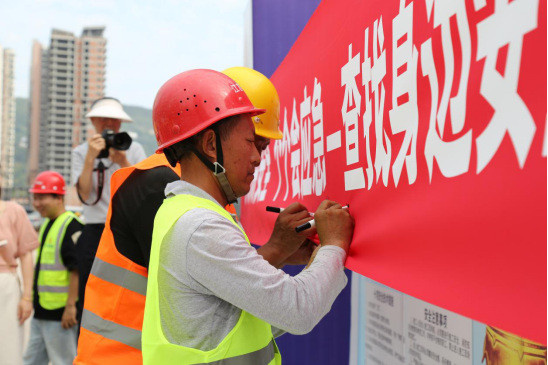 啟動(dòng)儀式上,公司黨總支副書記、總經(jīng)理馮皓代表業(yè)主單位致辭,宣布安全生產(chǎn)月活動(dòng)正式啟動(dòng)。馮皓強(qiáng)調(diào)安全生產(chǎn)對項(xiàng)目建設(shè)的重要性,要求全體人員將安全理念貫穿工作始終,積極參與各項(xiàng)安全活動(dòng)。并特別指出,張家河生態(tài)修復(fù)項(xiàng)目承載著改善區(qū)域生態(tài)環(huán)境、造福一方百姓的重要使命。作為項(xiàng)目業(yè)主,深知安全生產(chǎn)不僅是項(xiàng)目順利推進(jìn)的基石、守護(hù)建設(shè)者生命安全的防線,更是踐行社會(huì)責(zé)任、保障生態(tài)修復(fù)事業(yè)高質(zhì)量發(fā)展的核心要義。隨后,施工單位代表領(lǐng)誓,宣讀了《安全生產(chǎn)誓詞》。緊接著,參與人員在“安全生產(chǎn)月”主題橫幅上簽名,以莊重的形式明確自身安全責(zé)任。