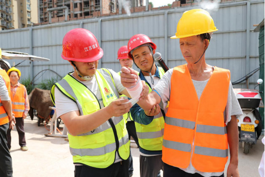啟動(dòng)儀式結(jié)束后,項(xiàng)目部工作人員迅速開展聯(lián)合應(yīng)急演練,模擬火災(zāi)、高處墜落等工地典型突發(fā)場景。演練中,現(xiàn)場示范滅火器的操作規(guī)范,講解使用要點(diǎn),并組織人員進(jìn)行實(shí)操訓(xùn)練,確保人人掌握滅火技能;隨后開展急救包扎演示教學(xué),切實(shí)提升人員應(yīng)急救護(hù)技能。